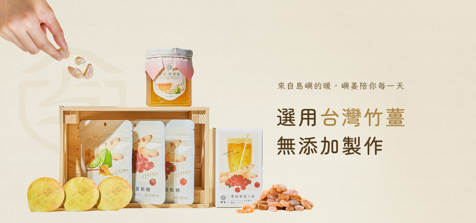 源於台灣的美麗島「嶼」、陪伴的「與」,使用台灣竹薑利用其特有的薑烯酚並且不添加代糖,除了讓消費者吃得到健康與安心,用不同的食用面貌與方式增加飲食上的多變化。